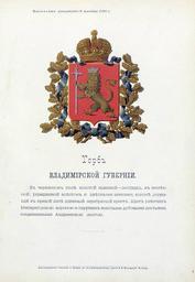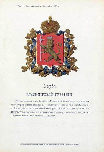 Keywords: Владимирская губерния из Бенке.jpg Official Russian Empire coat of arms Vladimir Governorate Ге б Российской Импе ии Владими ской губе нии с официальным описанием в Ге бовнике Бенке Утве ждён Импе ато ом Все оссийским Александ ом Вто ым Ге бы губе ний и областей Российской Импе ии Отпечатано по аспо яжению минист а внут енних дел Санкт-Пете бу г Ка тог афическое заведение А А Ильина и типог афия инисте ства путей сообщения А Бенке 1880 / Scanned on paper album 1856 / 1880 published Russian Empire PD-old-100 PD-RusEmpire PD-RU-exempt coats of arms <gallery> File Владими ская губ ВД Бенке jpg File Владими ская губе ния изд Сукачова JPG File Coat of Arms of Vladimir gubernia Russian empire png </gallery> Coats of arms of Vladimir Governorate Gerbovnik Benke Crowned lions in heraldry Crowns in crest Argent gules Or in heraldry Oak wreaths in supporters Crosses in heraldry