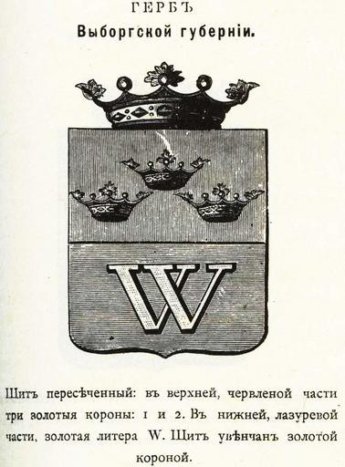Keywords: Выборгская губ из Винклера.jpg Official Russian Empire coat of arms Wyborg Governorate Гласный ге б Выбо гской губе нии Российской Импе ии Великого Княжества Финляндского с официальным описанием в Ге бовнике Винкле а П П фон-Винкле Ге бы го одов губе ний областей и посадов Российской Импе ии внесенные в Полное Соб ание законов с 1649 по 1900 год Дозволено цензу ою С -Пете бу г 20 Июля 1899 года Издание книгото говца Ив Ив Иванова С -Пете бу г Типог афия И Комелова П яжка д 3 1899 \ Scanned by Vizu 1899 published П П фон Винкле \ Pavel von Vinkler PD-old-100 PD-RusEmpire Gerbovnik Vinklera - Governorate Oblast CoAs Russian canting arms W in heraldry Coats of arms of Wyborg Governorate Coats of arms of Province of Viipuri