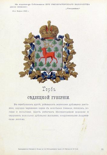 Keywords: Седлецкая губерния из Бенке.jpg Official Russian Empire coat of arms Sedletz Governorate Ге б Российской Импе ии Седлецкой губе нии с официальным описанием в Ге бовнике Бенке Утве ждён Импе ато ом Все оссийским Александ ом Вто ым Ге бы губе ний и областей Российской Импе ии Отпечатано по аспо яжению минист а внут енних дел Санкт-Пете бу г Ка тог афическое заведение А А Ильина и типог афия инисте ства путей сообщения А Бенке 1880 / Scanned on paper album 1869 / 1880 published Russian Empire PD-old-100 PD-RusEmpire PD-RU-exempt coats of arms <gallery> File Седлецкая губ ВД Бенке jpg File Coat of Arms of Siedlce gubernia Russian empire png </gallery> Coats of arms of Sedletz Governorate Gerbovnik Benke Leaves in heraldry Oak wreaths in supporters Stags in heraldry Semy shields |