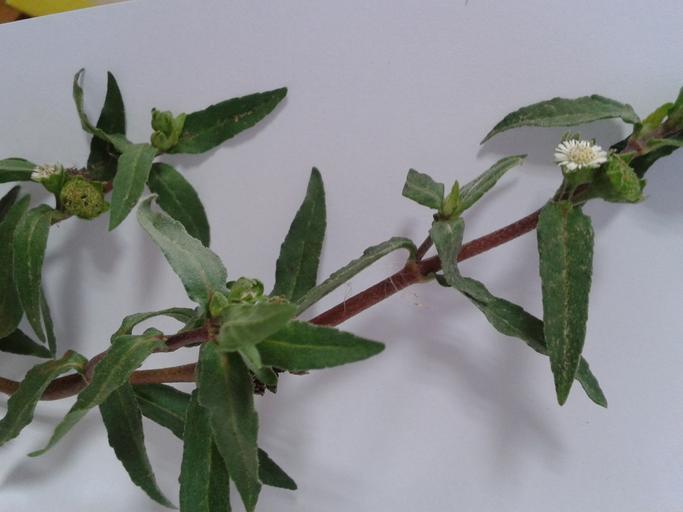 Keywords: கரிசலாங்கண்ணி(வெள்ளை)3.jpg en Botanical name - Eclipta prostrata Common name - False Daisy Tamil name KARISALAANG KANNI blackening plant Leaf extract is a liver tonic; Black dye from Eclipta prostrata is used for dyeing hair;Traditional medicine for athlete's foot eczema and dermatitis; Used as anti-venom against snakebite; For children it removes phlegm; It cures wounds ; For jaundice it is a traditional medicine In picture - Stem with leaves and typical white flower of KARISALAANGKANNI ta கரிசலாங்கண்ணி வெள்ளை வேறு தமிழ்ப் பெயர்கள் -கையாந்தரை கரப்பான் கரிசாலை; கைகேசி கைவ சி கரியசாலை கரிப்பான் கையான் ஆயுள் ந டிக்கும் ; பித்தத்திற்கு மருந்து இது;புற்று நோய்க் கிருமிகளைக் கொல்லும்;ஈரல் வ க்கத்திற்கு மருந்தாகக் கொடுக்கப்படுகிறது;மஞ்சள் காமாலைக்கு இது மருந்து;பெண்களின் பெரும்பாட்டுக்கு மருந்தாகும்; குழந்தைச் சளிக்குப் பரம்பரை மருந்து இதுவாகும்; இரும்புச் சத்தும் வைட்டமின் ஏயும் உள்ளன;க ரையாக இலையை உண்ணலாம்;திப்பிலிப் பொடியுடன் ஆஸ்த்மா மருந்தாகத் தருவர்;தலைப் பொடுகிற்கு இதனை மருந்தாகத் தருவர்;இலையைப் பல் துலக்கப் பயன்படுத்துவர்;இலைச் சாறு அழுகிய புண்களை ஆற்றும் என்பர் படம் - வெள்ளைக் கரிசலாங் கண்ணியின் இன்னொரு தோற்றம் Own research Dr S Soundarapandian 2013-10-16 Own field work Shot in Chennai Tamilnadu India 4 5 kms off sea-shore ; Latitude-13°02'20 N ; Longitude- 80°13'43 E ; Elevation from sea level - 6 7 m Cc-zero Unidentified Asteraceae |