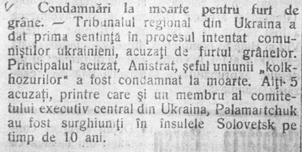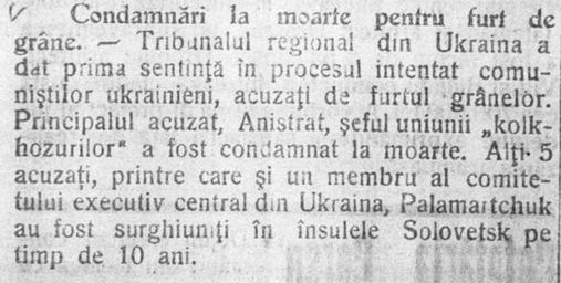 Keywords: Засуджений до смерті за крадіжку зерна.jpg uk ате іали д укованої п еси науково-довідкової бібліотеки де жавного а хіву Че нівецької області які висвітлюють події Голодомо у на Ук аїні 1932 1933 оків Газета Glasul Bucovinei 20 січня 1933 3973 с 4 Author 1933 Holodomor Glasul Bucovinei PD-old Funds of state archive of Chernivtsi Oblast