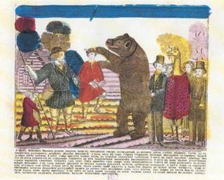 | Keywords: Мишенька Иваныч.jpg  ru «А ну-тка  ишенька Иваныч » Лубочная ка тинка печатанная в литог афии А Ав амова  1866 <br /> Рисунок соп овождается надписью «А ну-тка  ишенька Иваныч Родом боя ыч Ходи ну похаживай Гово и-погова ивай Да не гнись дугой Словно мешок тугой Да ну пово отись Разве нись Доб ым людям покажись А ну-ка вот ну как ста ые ста ушки  олодые молодушки  а ба щину ходили До ды пяты сносили А как теща п о зятя блины пекла Да уго ела Головушка заболела А вот ну как к асные девицы моются Белятся  умянятся В зе кальце глядятся Да из-под  ученьки женишков выглядывают А вот ну как малые  ебятишки го ох во овали Тишком-тайком  где сухо Там б юхом Где мок о там на коленочках А вот ну ходи- асходись Во всем на оде покажись А ну как конные д агуны в поход ходили Ружьем метали А тикулы выкидали А вот как с по охом сума Оттянула все плеча А ну-ка вот ну как муж у жены Вино во ует А холостой па ень по чужой жене тоскует Ходи не спотыкайся Впе ед подавайся Разгуляйся Вались да катись Бока не зашиби сам себя бе еги А ну женка в гости пошла С собой гусли взяла  ужа п очь п огнала А ну вот  у как наши бабенки в баню ходили Винцо с собой носили  а полок заби ались  а спинке валялись Веничком махали Животики п оти али » 1866 http //a-pesni org/teatr/rusnarod/michenka htm author PD-old-100 Uploaded with UploadWizard Bright Week in Russia Lubok Mummers Play in Russia Easter Bear comedy in Russia Bear guiding rite in Russia |