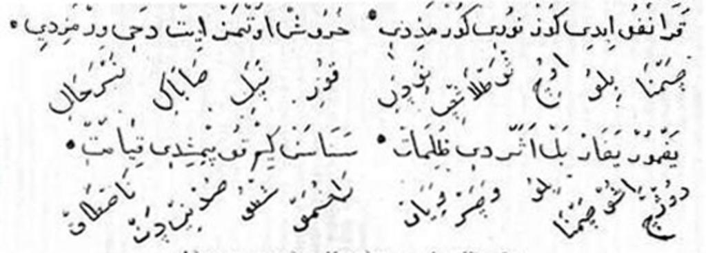 Keywords: Мерадж з Аль-Кітаба на беларускай мове арабскім алфавітам.jpg be У ывак з легенды « е адж» з «Аль-Кетаба» Гэта напісана па-бела уску «цемна било очи светласци невидзели / ку и непели сабаки неб ехали / дожч ишов цемна било веце вейав / азумев што судний дзен настав» Цю кскі тэкст оўна бела ускі пад ім наўскос XVII cent http //content onliner by/news/2012/09/default/a0cee9a76f718259948ef011d85d95c6 jpg author Custom license marker 2012 09 19 PD-old Uploaded with UploadWizard Belarusian Arabic alphabet Arabic script Arabic script in non-Arabic languages