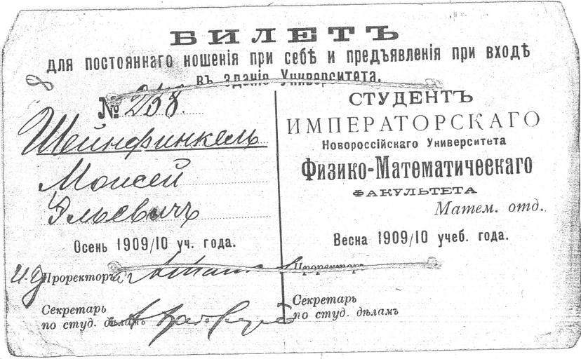 Keywords: Студенческий билет Моисея Шейнфинкеля.png ru студенческий билет оисея Шейнфинкеля на 1909/10 гг студента Импе ато ского ово оссийского Униве ситета физико-математического факультета математического отделения en Moses Schonfinkel student permit to Imperial Novorossiya University Odessa University in 1910 2012-11-13 Доклады Одесского семина а по диск етной математике Одесса Экология 2011 вып 12 ISBN 978-966-8740-81-7 Се гей Т опанец PD-old Uploaded with UploadWizard 1909 documents Educational documents of the Russian Empire Student identity cards of Russia
