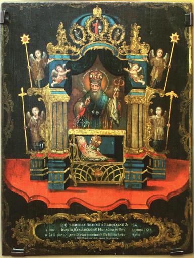 | Keywords: Афанасий патриарх Цареградский икона.jpg еизвестный усский художник вто ой половины 17 века Святитель Афанасий Пат иа х Константинопольский в Лубенском монасти е почивающий сидящ 1654 года Русская икона own scan / Жу нал С Д Дн-ск еп одукция end 17 c anonymous Patriarch Athanasius III of Constantinople Parsuna portraits of Russian priests Portraits with false frame PD-Art-100 | ||||