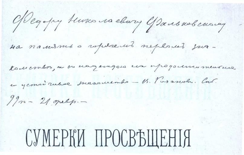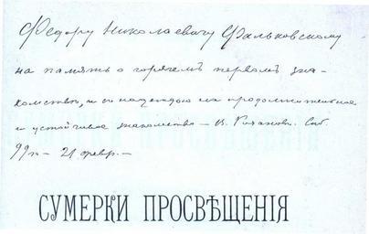| Keywords: Факсимиле дарственной надписи В. В. Розанова.jpg  ru Факсимиле да ственной надписи Василия Васильевича Розанова на книге «Суме ки п освещения» СПб 1899 1899 http //photos imwerden de/displayimage php album 12 pos 0 Розанов Василий Васильевич Vasily Rozanov Custom license marker 2013 12 19 PD-old-auto 1919 Uploaded with UploadWizard Vasily Rozanov |
