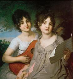 Keywords: groupshot people Владимир Боровиковский - Портрет сестер княжон Анны Гаврииловны и Варвары Гаврииловны Гагариных Explore irinaraquel's 19728 photos on Flickr! Borovikovsky pt gagarinyh.jpg Artwork Creator Vladimir Borovikovsky Portrait of the Sisters Princess Anna Gavriilovna Gagarina and Princess Varvara Gavriilovna Gagarina The portrait depicts the members of the Russian princely family w Gagarin family Gagarin the daughters of Actual Privy Councilor Gavriil Petrovich Gagarin on the right with a music paper Anna Gavriilovna Gagarina 1782 1856 the married family name Golovina the monastic name Ioanna; on the left with a guitar Varvara Gavriilovna Gagarina 1784 1802 the married family name Elgunova or Sigunova а ка тине изоб ажены доче и действительного статского советника w Гага ин Гав иил Пет ович Гав иила Пет овича Гага ина ru сп ава де жит нотный лист Анна Гав ииловна Гага ина 1782 1856 в замужестве Головина в иночестве Иоанна; слева с гита ой Ва ва а Гав ииловна Гага ина 1784 1802 в замужестве Елгунова или Сигунова 1802 Oil on canvas size cm 69 2 75 Tretyakov Gallery LangSwitch The main building of the gallery 10 Lavrushinsky Pereulok Главное здание гале еи Лав ушинский пе 10 7 cite web V L Borovikovsky Portrait of Princess A G Gagarina and Princess V G Gagarina http //www tretyakovgallery ru/en/collection/_show/image/_id/404 State Tretyakov Gallery 16 May 2012 English <br> cite web В Л Бо овиковский По т ет сестё княжон А Г и В Г Гага иных http //www tretyakovgallery ru/ru/collection/_show/image/_id/404 Госуда ственная Т етьяковская гале ея 16 May 2012 Russian <br> cite book Госуда ственная Т етьяковская гале ея Каталог живописи XVIII начала ХХ века до 1917 года осква Изоб азительное искусство 1984 109 ru object history LangSwitch 1907 purchased by the Council of Tretyakov Gallery from V F Kostareva п иоб етена Советом Т етьяковской гале еи в 1907 г у В Ф Коста евой exhibition history credit line LangSwitch on the balustrade behind the sisters на баллюст аде позади сестё ru Painted by Borovikovsky 1802th Year accession number 109 http //lj rossia org/users/john_petrov/414961 html <gallery>File Les Princesses Anne et Varvara Gagarine jpg Russian Portraits by w Grand Duke Nicholas Mikhailovich of Russia Grand Duke Nicholas Mikhailovich Moscow 1905 1909 онох омная еп одукция из пятитомного издания Русские по т еты XVIII и XIX столетий Издание Великого князя иколая ихайловича «Русские по т еты XVIII и XIX столетий» ru вел кн иколая ихайловича осква 1905 1909 </gallery> LangSwitch See also См также LangSwitch The reproduction of the portrait<br>on the stamp Реп одукция ка тины<br>на почтовой ма ке <gallery> Stamp of Russia 2007 No 1180 Anna and Varvara Gagarin by Borovikovsky jpg LangSwitch The stamp of Russia 15 May 2007 Michel No 1412 Почтовая ма ка России 15 мая 2007 г Каталог ИТЦ « а ка» 1180 </gallery> PD-old-100 Anna and Varvara Gagarin Borovikovskiy 1802 oil on canvas paintings 1800s portrait paintings of Russia female 19th-century oil on canvas paintings in Russia 1800s oil portraits of women at half length Portrait paintings with the balcony Family portraits of Russia Portraits with guitars Portraits of sisters Art works uploaded by Andrew Butko from various sources 1000-1999 px on long side 1802 portrait paintings Originals of images from Russian portraits by Nicholas Mikhailovich Romanov Files uploaded by Andrew Butko from various sources 19th century |