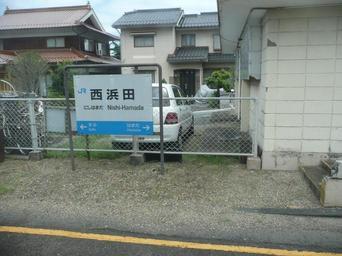 Keywords: 西浜田駅看板.JPG Nishihamada Station sign 西 田駅の Own ペ 家音 2009-07-30 Train station signs in Shimane prefecture Nishi-Hamada Station