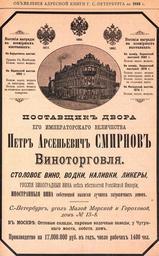 Keywords: Реклама виноторговли П. А. Смирнова, 1893.jpg ru Реклама виното говли П А Сми нова 1893 год 2014-12-19 00 10 34 авто часть ссылка часть заглавие Ад есная книга го ода С -Пете бу га на 1893 год о игинал ссылка викитека ответственный Ред П О Яблонский издание место СПб издательство Лештуковская па овая ско опечатня П О Яблонского год 1893 том ст аницы столбцы ст аниц се ия ти аж author other versions PD-old-70-1923 Uploaded with UploadWizard Advertising in Russia Pyotr Arsenievich Smirnov |