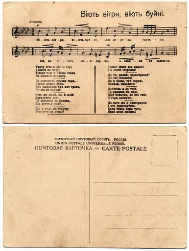 Keywords: Віють вітри, віють буйні (листівка-2).jpg en Postcard with lyrics and music of folk song uk Поштова листівка зі словами та музикою на одної пісні self-scanned Marusia Churai en а уся Чу ай а усі Чу ай uk 1917 Віють віт и віють буйні листівка-1 jpg 1910s postcards Backs of postcards Ukrainian folk songs 20th-century postcards of Russia Marusia Churai PD-old-100 |