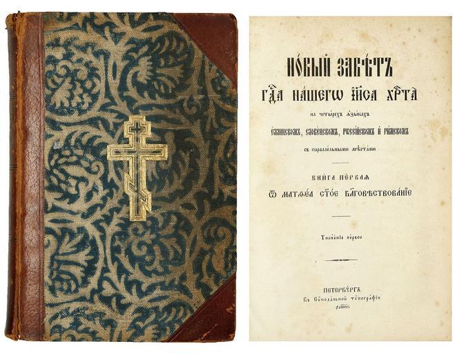 | Keywords: Новый Завет Господа нашего Иисуса Христа на четырёх языках.jpg  ru Обложка и титульный лист славяно-г еко-латино- усской полиглотты 1886 http //www auction-imperia ru/wdate php t clublot i 4085 Пёт Анд еевич Гильтеб андт 1840  1905 other versions PD-old-70-1923 Uploaded with UploadWizard Polyglot bibles |
