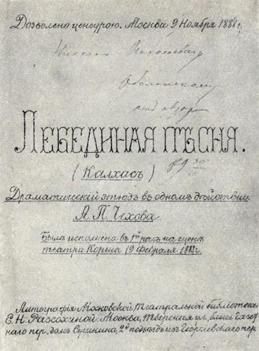 Keywords: Лебединая песня (Калхас) литографированный оттиск 1888.jpg ru Лебединая песня Калхас литог афи ованный оттиск 1888 г 1888 http //apchekhov ru/books/item/f00/s00/z0000025/st004 shtml Литог афия осковской теат альной библиотеки Е Рассохиной ценз аз 9 нояб я 1888 г other versions Custom license marker 2015 12 23 PD-old-100 Anton Pavlovich Chekhov Uploaded with UploadWizard |