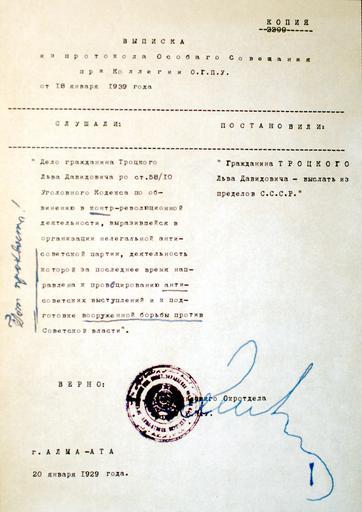 | Keywords: Выписка из протокола по делу Троцкого.jpg Выписка из п отокола Особого Совещания п и коллегии О Г П У Extract from the minutes of the State Political Directorate ОГПУ special meeting that ordered the expulsion of Leon Trotsky from the Soviet Union Госуда ственный музей политической исто ии России 1929-01-20 author PD-Russia-2008 Leon Trotsky 19290120 Joint State Political Directorate USSR OGPU Documents of the Soviet Union 1929 | ||||