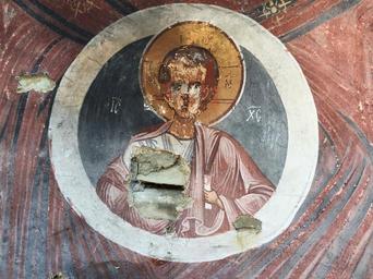 Keywords: Фреска на Христос во Убого.jpg mk Ф еска на Исус Х истос во ц квата во село Убого неготинско https //fbcdn-sphotos-e-a akamaihd net/hphotos-ak-xpf1/t31 0-8/10985529_10203771535508339_2323428909360446728_o jpg author century 19 PD-Macedonia Anonymous-EU Ubogo Frescos in the Republic of Macedonia