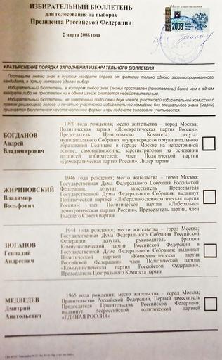 | Keywords: Бюллетень выборов президента РФ 2008.jpg Бюллетень с кандидатами на пост П езидента РФ на выбо ах 2008 года Бюлетень з кандидатами на пост П езидента РФ на вибо ах 2008 оку own 2008-03-02 George Shuklin PD-RU-exempt PD russian goverment Russian presidential elections 2008 Ballot papers in Russia |