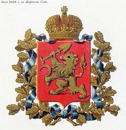 Keywords: Енисейская губ МВД Бенке.jpg Official Russian Empire coat of arms Enisei Governorate Ге б Российской Импе ии Енисейской губе нии в Ге бовнике ВД Утве ждён Импе ато ом Все оссийским Александ ом Вто ым Ге бы губе ний и областей Российской Импе ии Отпечатано по аспо яжению минист а внут енних дел Санкт-Пете бу г Ка тог афическое заведение А А Ильина и типог афия инисте ства путей сообщения А Бенке 1880 / Scanned on paper album 1878 / 1880 published Russian Empire PD-old-100 PD-RusEmpire PD-RU-exempt <gallery> File Енисейская губе ния из Бенке jpg File Енисейская губе ния изд Сукачова jpg File Coat of Arms of Enisey gubernia Russian empire png </gallery> Coats_of_arms_of_Yeniseysk Governorate Gerbovnik Benke Lions rampant or Crowns in crest Spades in heraldry Sickles in heraldry Oak wreaths in supporters Gules and Or in heraldry |