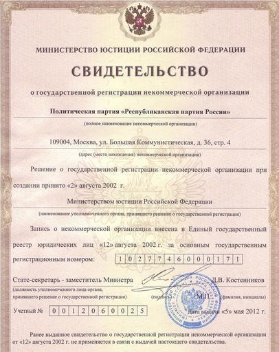 | Keywords: Свидетельство о государственной регистрации Республиканской партии России от 05.05.2012.jpg Свидетельство о госуда ственной егист ации Республиканской па тии России от 05 05 2012 http //svobodanaroda org/news/3397/ 05 05 2012 инюст РФ PD-RU-exempt People's Freedom Party |