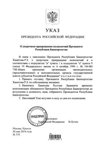 | Keywords: Указ Президента РФ от 30.05.2014 N 378.png ru Указ П езидента РФ от 30 05 2014 N 378 О дос очном п ек ащении полномочий П езидента Республики Башко тостан 2014-05-30 http //graph document kremlin ru/page aspx 1;3635533 П езидент Российской Феде ации other versions Custom license marker 2015 01 09 PD-RU-exempt Uploaded with UploadWizard History of Bashkortostan |