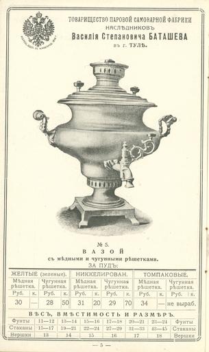 Keywords: Прейскурант самоварной фабрики В.С Баташева 5.jpg П ейску ант самова ной фаб ики В С Баташева < 1917 https //fotki yandex ru/users/humus777/album/379238/ not specified PD-RusEmpire Prices of Batashev's samovar factory