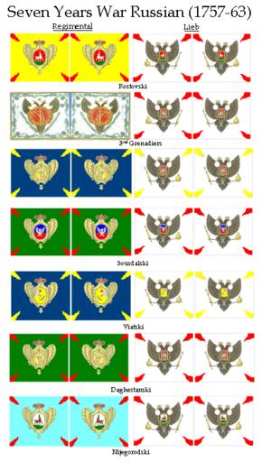 | Keywords: Знамя России Мушкетер полкам 1730 г (Семилетняя война).gif  Flags of the Russian Musketeer Regiments 1730 Seven Years War Rostovski Rostov 3rd Grenadiers Nasheburgskii Nasheburg Soudalski Suzdal Viatski Daghestamski Daghestam Nijegorodski Nijegorod ru Знамя России  ушкете полкам 1730 г Семилетняя война Полков 3-й г енаде ский Nasheburg Суздаль Viatski Дагестан  ижего одское 1730 http //www warflag com/flags/syw/sywrrus1 shtml Анна Иоанновна other versions insignia PD-RusEmpire Flag charts of Russia Flags of the Russian Musketeer Regiments 1730 pattern |