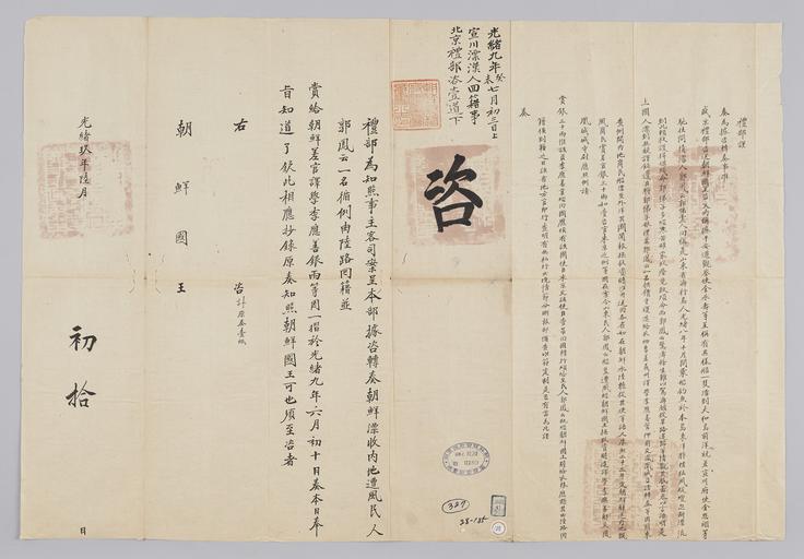 | Keywords: 조선-청 외교문서(자문) 127.jpg 고종 20년 1883 6월 10 에 청국 예 에 조선국왕에게 보내 온 문 선 宣 평안북도 소재 에 류하고 있던 곽봉운 郭鳳云 회적 回籍 하는 과 맡 주 義州 역학 譯學 선 應善 에게 포상하는 건 알리는 내용 다 평안도 찰사 영수 金永壽 에 하면 양선 1척 화도 大和島 에 류해왔는데 선 사 전사 全 翊 등 살펴보니 산동성 신 곽봉운·곽 자 郭悌子 2명 배를 고 조업 나왔다 갑자기 풍랑 만나 곳에 오게 되었는데 그 중 곽 자는 사 하고 곽봉운만 겨우 목숨 하게 되었다고 다 2016-07-18 http //www nl go kr/nl/search/SearchDetail nl category_code ct service KOLIS vdkvgwkey 1130176 colltype DAN_OLD place_code_info 172 place_name_info EB 94 94 EC A7 80 ED 84 B8 EC 97 B4 EB 9E 8C EC 8B A4 manage_code MA shape_code B refLoc null category srchFlag Y h_kwd E5 8F A4 E6 9C 9D51- EB 8B A428-185 lic_yn N mat_code RB 국립중앙도 조선국왕 청국예 other versions PD-Art Books from National Library of Korea Books from Korea 1883 in Relations of the Joseon Dynasty and the Qing Dynasty |