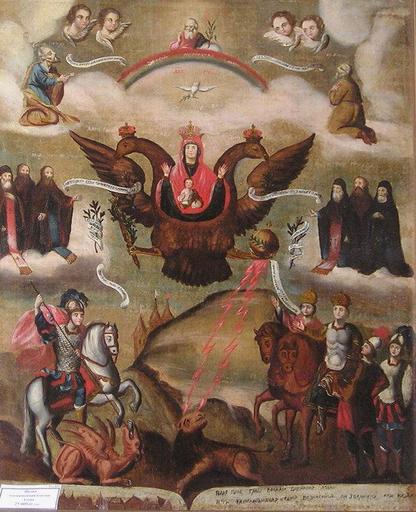 Keywords: Икона Богоматерь Азовская.jpg ru Икона Богомате ь Азовская Холст масло 73Х57 Ук аина се едина XVIIIв Почитание начинается п и ца ице Софии Алексеевне 1657 1704 со в емени пе вого похода к Азову в 1686 г под п едводительством князя В В Голицына Особенность иконог афии изоб ажение Богомате и с ладенцем на фоне двуглавого о ла де жащего в лапах скипет и де жаву символы госуда ственности аве ху в ок ужении ангельских сил Бог Саваоф и Святой Дух в виде голубя В молитвенном п едстоянии изоб ажены свв Антоний Феодосий и Алипий Пече ские оисей Уг ин П охо а к; ниже в об азе Гео гия Победоносца конный воин побивающий копьем змия а также изоб ажение пеших и конных воинов; на нижнем поле помещены ви ши ыне х анится в узее исто ии елигии в Санкт-Пете бу ге П азднование 19 июля 1 августа century 18 http //www gelos ru/sale/ikona/kiev shtml Author other versions Custom license marker 2016 10 16 PD-old-100 Intercession of the Theotokos Folk icons