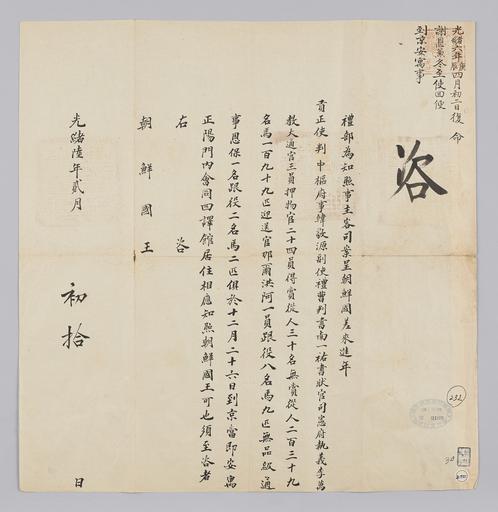 | Keywords: 조선-청 외교문서(자문) 023.jpg ko 鮮差來年貢正使判中樞 事韓敬源副使禮曺判書南祐書 官司憲 執義 萬敎大 3員押物官24員得賞從人30名無賞從人239名馬199匹12 29日到京하여 正陽 內 4同譯館에 安寓했다는 移咨 4 2日 復命 2016-07-18 http //www nl go kr/nl/search/SearchDetail nl category_code ct service KOLIS vdkvgwkey 1130072 colltype DAN_OLD place_code_info 172 place_name_info EB 94 94 EC A7 80 ED 84 B8 EC 97 B4 EB 9E 8C EC 8B A4 manage_code MA shape_code B refLoc null category srchFlag Y h_kwd E5 8F A4 E6 9C 9D51- EB 8B A428-30 lic_yn N mat_code RB 국립중앙도 조선국왕 수급 청국예 급 other versions PD-Art Books from National Library of Korea Books from Korea 1880 in Relations of the Joseon Dynasty and the Qing Dynasty |