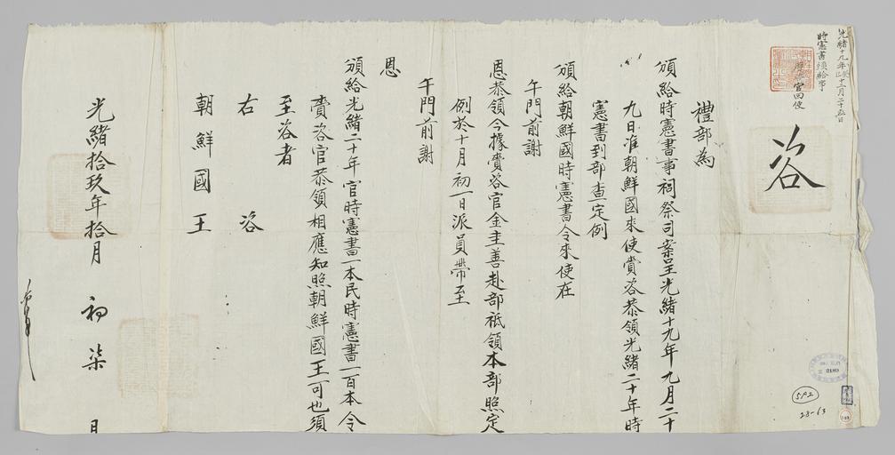 | Keywords: 조선-청 외교문서(자문) 050.jpg ko 鮮 差來領時憲書賚咨官金奎善等 來午 前10 1日 恩頒給20年官曆 民曆 恭領知照를 禮部 터 移咨12 25日復命 2016-07-18 http //www nl go kr/nl/search/SearchDetail nl category_code ct service KOLIS vdkvgwkey 1130227 colltype DAN_OLD place_code_info 172 place_name_info EB 94 94 EC A7 80 ED 84 B8 EC 97 B4 EB 9E 8C EC 8B A4 manage_code MA shape_code B refLoc null category srchFlag Y h_kwd E5 8F A4 E6 9C 9D51- EB 8B A428-63 lic_yn N mat_code RB 국립중앙도 조선국왕 수급 청국예 급 other versions PD-Art Books from National Library of Korea Books from Korea 1893 in Relations of the Joseon Dynasty and the Qing Dynasty |