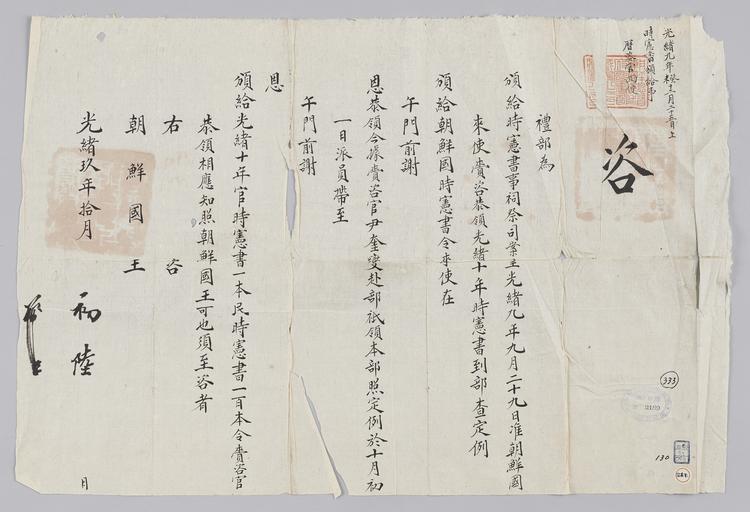 | Keywords: 조선-청 외교문서(자문) 093.jpg 고종 20년 1883 10월 6 에 청국 예 에 조선국왕에게 보내 온 문 조선에 파견 헌 재자 에게 에 따 10월 1 에 헌 1본 민 헌 100본 반급하 다고 알리는 내용 다 2016-07-18 http //www nl go kr/nl/search/SearchDetail nl category_code ct service KOLIS vdkvgwkey 1130170 colltype DAN_OLD place_code_info 172 place_name_info EB 94 94 EC A7 80 ED 84 B8 EC 97 B4 EB 9E 8C EC 8B A4 manage_code MA shape_code B refLoc null category srchFlag Y h_kwd E5 8F A4 E6 9C 9D51- EB 8B A428-130 lic_yn N mat_code RB 국립중앙도 조선국왕 청국예 other versions PD-Art Books from National Library of Korea Books from Korea 1883 in Relations of the Joseon Dynasty and the Qing Dynasty |