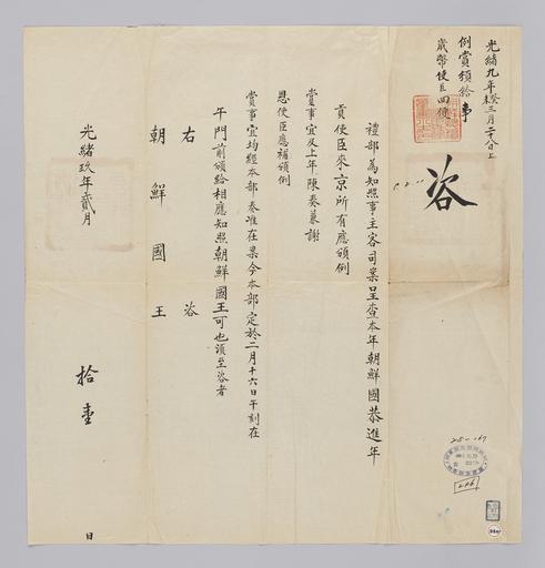 | Keywords: 조선-청 외교문서(자문) 109.jpg 고종 20년 183 2월 11 에 청국 예 에 조선국왕에게 보내 온 문 올해 파견되어 온 진공사신과 작년 진주 陳奏 겸 사 사신에게 2월 16 오각에 오문 앞에 상 반급 다고 알리는 내용 다 2016-07-18 http //www nl go kr/nl/search/SearchDetail nl category_code ct service KOLIS vdkvgwkey 1130207 colltype DAN_OLD place_code_info 172 place_name_info EB 94 94 EC A7 80 ED 84 B8 EC 97 B4 EB 9E 8C EC 8B A4 manage_code MA shape_code B refLoc null category srchFlag Y h_kwd E5 8F A4 E6 9C 9D51- EB 8B A428-167 lic_yn N mat_code RB 국립중앙도 조선국왕 청국예 other versions PD-Art Books from National Library of Korea Books from Korea 1883 in Relations of the Joseon Dynasty and the Qing Dynasty |