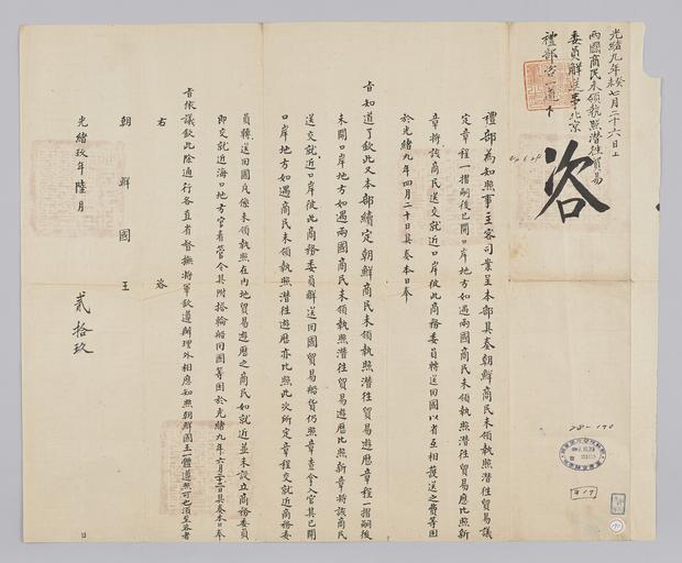 | Keywords: 조선-청 외교문서(자문) 112.jpg 고종 20년 1883 6월 29 에 청국 예 에 조선국왕에게 보내 온 문 양국 상민 집조 執照 를 않고 몰래 무역하면 상무 원 보내 엄하게 단속 다고 알리는 내용 다 집조 외국 사람 길 다니는데 편 를 해 급하는 통행 허 2016-07-18 http //www nl go kr/nl/search/SearchDetail nl category_code ct service KOLIS vdkvgwkey 1130186 colltype DAN_OLD place_code_info 172 place_name_info EB 94 94 EC A7 80 ED 84 B8 EC 97 B4 EB 9E 8C EC 8B A4 manage_code MA shape_code B refLoc null category srchFlag Y h_kwd E5 8F A4 E6 9C 9D51- EB 8B A428-170 lic_yn N mat_code RB 국립중앙도 조선국왕 청국예 other versions PD-Art Books from National Library of Korea Books from Korea 1883 in Relations of the Joseon Dynasty and the Qing Dynasty |