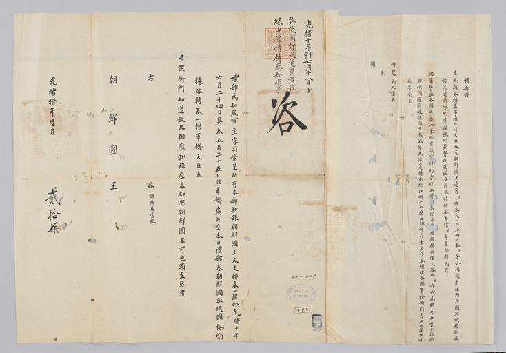 | Keywords: 조선-청 외교문서(자문) 161.jpg 고종 21년 1884 6월 27 에 청국 예 에 조선국왕에게 보내 온 문 조선과 아국 俄 러 아 통상장정 맺 것에 해 황 에게 아뢰었더니 알았다고 전하는 내용 다 조선과 러 아는 1884년 5월 16 에 우호통상조약 俄 約 체결하 다 2016-07-19 http //www nl go kr/nl/search/SearchDetail nl category_code ct service KOLIS vdkvgwkey 1130130 colltype DAN_OLD place_code_info 172 place_name_info EB 94 94 EC A7 80 ED 84 B8 EC 97 B4 EB 9E 8C EC 8B A4 manage_code MA shape_code B refLoc null category srchFlag Y h_kwd E5 8F A4 E6 9C 9D51- EB 8B A428-229 lic_yn N mat_code RB 국립중앙도 조선국왕 수급 청국예 급 other versions PD-Art Books from National Library of Korea Books from Korea 1884 in Relations of the Joseon Dynasty and the Qing Dynasty |