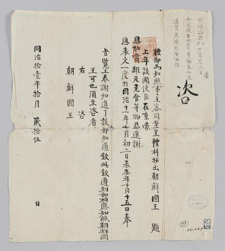 | Keywords: 조선-청 외교문서(자문) 211.jpg 고종 9년 1872 10월 25 에 청국 예 에 조선국왕에게 보내 온 문 해 동 사 행에게 상 加賞 것에 해 조선국왕 올린 사 를 황 에게 올렸다고 알리는 내용 다 2016-07-19 http //www nl go kr/nl/search/SearchDetail nl category_code ct service KOLIS vdkvgwkey 1130370 colltype DAN_OLD place_code_info 172 place_name_info EB 94 94 EC A7 80 ED 84 B8 EC 97 B4 EB 9E 8C EC 8B A4 manage_code MA shape_code B refLoc null category srchFlag Y h_kwd E5 8F A4 E6 9C 9D51- EB 8B A428-289 lic_yn N mat_code RB 국립중앙도 조선국왕 청국예 other versions PD-Art Books from National Library of Korea Books from Korea 1872 in Relations of the Joseon Dynasty and the Qing Dynasty |