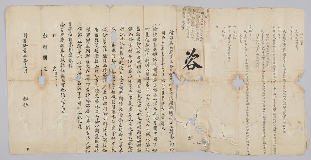 | Keywords: 조선-청 외교문서(자문) 228.jpg 고종 9년 1872 11월 5 에 청국 예 에 조선국왕에게 보내 온 문 조선 경내에 비적선 匪賊船 에 쫓겨 온 중국 상선 4척 보호하고 비적 격파하느 고 조선 군사 사상 死傷 되었다는 조선국왕 보고에 하여 산동 무사 山 巡撫使 에게 명하여 해적들 소탕하도 명 내렸 알리는 문 다 2016-07-19 http //www nl go kr/nl/search/SearchDetail nl category_code ct service KOLIS vdkvgwkey 1130367 colltype DAN_OLD place_code_info 172 place_name_info EB 94 94 EC A7 80 ED 84 B8 EC 97 B4 EB 9E 8C EC 8B A4 manage_code MA shape_code B refLoc null category srchFlag Y h_kwd E5 8F A4 E6 9C 9D51- EB 8B A428-306 lic_yn N mat_code RB 국립중앙도 조선국왕 청국예 other versions PD-Art Books from National Library of Korea Books from Korea 1872 in Relations of the Joseon Dynasty and the Qing Dynasty |
