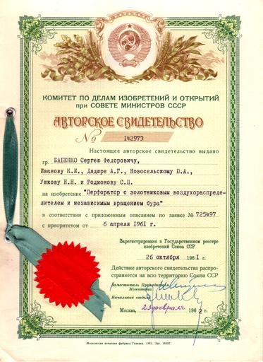 Keywords: Перфоратор с золотниковым воздухораспределителем и независимым вращением бура.png ru Авто ское свидетельство 142973 от 26 октяб я 1961 года 2013-04-12 17 42 33 own Folax PD-RU-exempt Insignia cc-by-sa-3 0 Invention author s certificate