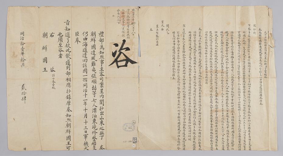 | Keywords: 조선-청 외교문서(자문) 289.jpg 고종 9년 1872 10월 24 에 청국 예 에 조선국왕에게 보내 온 문 7월 3 도 石島 바닷 에 조선 배 1척 풍랑 만나 중국 떠내려 왔는데 그 배에 고 있던 조선 충청도 진 津 강경포 江鏡浦 사람 장 철 張順喆 등 7명 해도 海道 보낸다고 알리는 내용 다 2016-07-19 http //www nl go kr/nl/search/SearchDetail nl category_code ct service KOLIS vdkvgwkey 1130371 colltype DAN_OLD place_code_info 172 place_name_info EB 94 94 EC A7 80 ED 84 B8 EC 97 B4 EB 9E 8C EC 8B A4 manage_code MA shape_code B refLoc null category srchFlag Y h_kwd E5 8F A4 E6 9C 9D51- EB 8B A428-371 lic_yn N mat_code RB 국립중앙도 조선국왕 청국예 other versions PD-Art Books from National Library of Korea Books from Korea 1872 in Relations of the Joseon Dynasty and the Qing Dynasty |