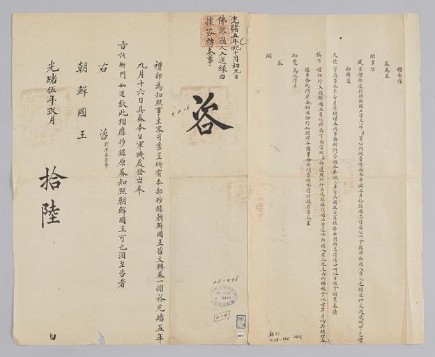 | Keywords: 조선-청 외교문서(자문) 293.jpg 고종 16년 1879 9월 16 에 청국 예 에 조선국왕에게 보내 온 문 3월 조선 충청도 공주에 잡 프랑스 올돌 崔 乭 봉황성 鳳凰城 차송하 다는 조선 자문 황 에게 아뢰었 알리는 내용 다 고종실 16권 1879년 고종 16 8월 29 에 주 임 수 林翰洙 올린 장계에 하면 올돌 오랫동안 책문 柵 에 머물러 둘 수 없기 때문에 급히 훈도 訓導 하여금 봉성장 鳳城將 에게 압송해 들여보냈다 고 되어 있다 2016-07-19 http //www nl go kr/nl/search/SearchDetail nl category_code ct service KOLIS vdkvgwkey 1130090 colltype DAN_OLD place_code_info 172 place_name_info EB 94 94 EC A7 80 ED 84 B8 EC 97 B4 EB 9E 8C EC 8B A4 manage_code MA shape_code B refLoc null category srchFlag Y h_kwd E5 8F A4 E6 9C 9D51- EB 8B A428-376 lic_yn N mat_code RB 국립중앙도 조선국왕 청국예 other versions PD-Art Books from National Library of Korea Books from Korea 1879 in Relations of the Joseon Dynasty and the Qing Dynasty |