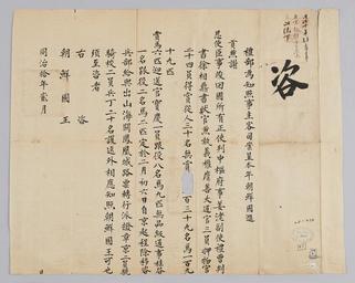 | Keywords: 조선-청 외교문서(자문) 295.jpg 고종 8년 1871 2월에 청국 예 에 조선국왕에게 보내 온 문 조선에 보낸 동 겸 사 사 정사 강노 사 상정 장 권 선 등 행 마치고 달 초 6 에 북경 다고 알리는 내용 다 2016-07-19 http //www nl go kr/nl/search/SearchDetail nl category_code ct service KOLIS vdkvgwkey 1130407 colltype DAN_OLD place_code_info 172 place_name_info EB 94 94 EC A7 80 ED 84 B8 EC 97 B4 EB 9E 8C EC 8B A4 manage_code MA shape_code B refLoc null category srchFlag Y h_kwd E5 8F A4 E6 9C 9D51- EB 8B A428-378 lic_yn N mat_code RB 국립중앙도 조선국왕 청국예 other versions PD-Art Books from National Library of Korea Books from Korea 1871 in Relations of the Joseon Dynasty and the Qing Dynasty |