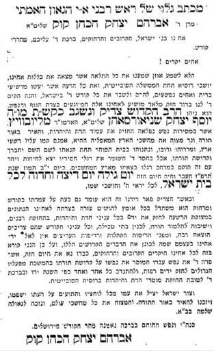 | Keywords: מכתב אברהם יצחק הכהן קוק לכבוד יב בתמוז תרפח.jpg he מכתב-מודעה ש הרב אברה יצחק הכהן קוק בעיתון דואר היו כבוד י ב בתמוז תרפ ח - יו השנה שחרורו ש רבי יוסף יצחק שניאורסון מהכ א הסובייטי 1928-06-22 http //www jpress nli org il/Olive/APA/NLI_heb/SharedView Article aspx href DHY 2F1928 2F06 2F22 id Ar00408 sk 4C5F6611 www jpress nli org il דאר היו - איתמר בן-אב י 1882-1943 אברה יצחק הכהן קוק 1865-1935 other versions PD-old-auto 1943 Abraham Isaac Kook Yosef Yitzchak Schneersohn Chabad Documents Doar HaYom 1928 in HaYishuv Title pages in Hebrew |