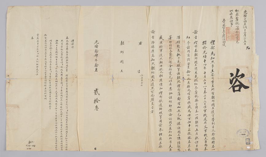| Keywords: 조선-청 외교문서(자문) 344.jpg 고종 25년 1888 10월 23 에 청국 예 에 조선국왕에게 보내 온 문 조선에 파견 재자 등 사신 고 온 홍삼 紅蔘 에 해 면세 다고 알리는 내용 다 2016-07-20 http //www nl go kr/nl/search/SearchDetail nl category_code ct service KOLIS vdkvgwkey 1129973 colltype DAN_OLD place_code_info 172 place_name_info EB 94 94 EC A7 80 ED 84 B8 EC 97 B4 EB 9E 8C EC 8B A4 manage_code MA shape_code B refLoc null category srchFlag Y h_kwd E5 8F A4 E6 9C 9D51- EB 8B A428-488 lic_yn N mat_code RB 국립중앙도 조선국왕 청국예 other versions PD-Art Books from National Library of Korea Books from Korea 1888 in Relations of the Joseon Dynasty and the Qing Dynasty |