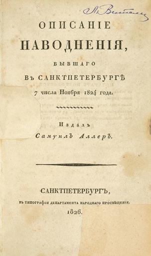 | Keywords: Аллер С. Описание наводнения, бывшего в Санкт-Петербурге 7 числа ноября 1824 года. (1826). — Тит. лист.jpg Описание наводнения бывшего в Санкт-Пете бу ге 7 числа нояб я 1824 года Титульный лист 1826 https //ru bidspirit com/portal/ /catalog/auction/55278f92e4b0c2c600f47db2/ Самуил Алле PD-RusEmpire Books from Russia 1826 Books published in Saint Petersburg Title pages uploaded by Steven Pavlov from various sources Saint Petersburg Floods 1824 | ||||