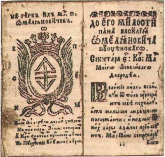 View Original:Віленская брацкая друкарня. Малітвеннік.1702. Герб і пачатак прысвячэння В. Амельяновічу-Пусценскаму.jpg (433x413)