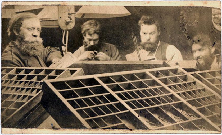 View Original:Наборня, где набрали -Вперед!- и разные брошюры. Слева направо П.Л. Лавров, Я.В. Вощакин, А.Л. Линев, Л.Б. Гольденберг.jpg (580x354)