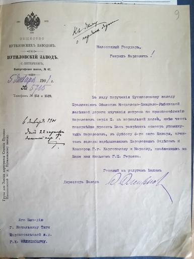 Keywords: цгиа спб цгиаспб исторический царскосельская ж.д. царскосельскаяжд московско-виндаво-рыбинская железная дорога московсковиндаворыбинскаяжелезнаядорога railway россия russia путиловский завод путиловскийзавод письмо начальник тяги начальниктяги филлипович генрих карлович филлиповичгенрихкарлович санкт-петербург санктпетербург text document writing Письмо директора Путиловского завода Начальнику тяги Царскосельской железной дороге Генриху Карловичу Филлиповичу о переделки паровозов на нормальную колею. 5 Января 1901 г. Письмо директора Путиловского завода Начальнику тяги Царскосельской железной дороге Генриху Карловичу Филлиповичу о переделки паровозов на нормальную колею. 5 Января 1901 г.