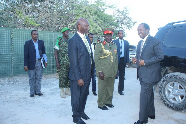 | Keywords: outdoor Somali President, Hassan Sheikh Mohamud, arrives with Uganda's Ambassador to Somalia, Maj. Gen. Nathan Mugisha, to the celebration of Uganda's 52nd anniversary of independence on October 9, 2014, in Mogadishu, Somalia. AMISOM Photo / Abdi Dagane Somali President, Hassan Sheikh Mohamud, arrives with Uganda's Ambassador to Somalia, Maj. Gen. Nathan Mugisha, to the celebration of Uganda's 52nd anniversary of independence on October 9, 2014, in Mogadishu, Somalia. AMISOM Photo / Abdi Dagane |