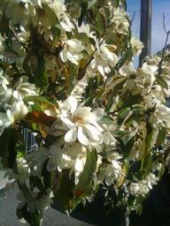 Keywords: अनंताची फुले.jpg mr अनंत वृक्ष ुडूप स्वरूपात हिवाळ्यात ुलै महिन्यात मेलबर्न येथे फुललेला वृक्ष दुपारच वेळ असून तापमान सुमारे १० अंश होते own Ninad Katyare Magnolia doltsopa