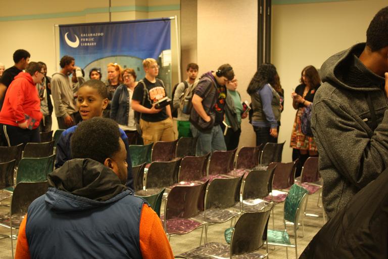 | Keywords: Award-winning author Jason Reynolds returned to Kalamazoo on Wednesday, April 13, 2016, for a Meet the Author event at Central Library. Jason recently received the prestigious Walter Dean Myers Award for Outstanding Children’s Literature, and the American Library Association’s 2016 Coretta Scott King Honor Award for outstanding African American authors. Photo by Farrell Howe. www.kpl.gov Award-winning author Jason Reynolds returned to Kalamazoo on Wednesday, April 13, 2016, for a Meet the Author event at Central Library. Jason recently received the prestigious Walter Dean Myers Award for Outstanding Children’s Literature, and the American Library Association’s 2016 Coretta Scott King Honor Award for outstanding African American authors. Photo by Farrell Howe. www.kpl.gov |