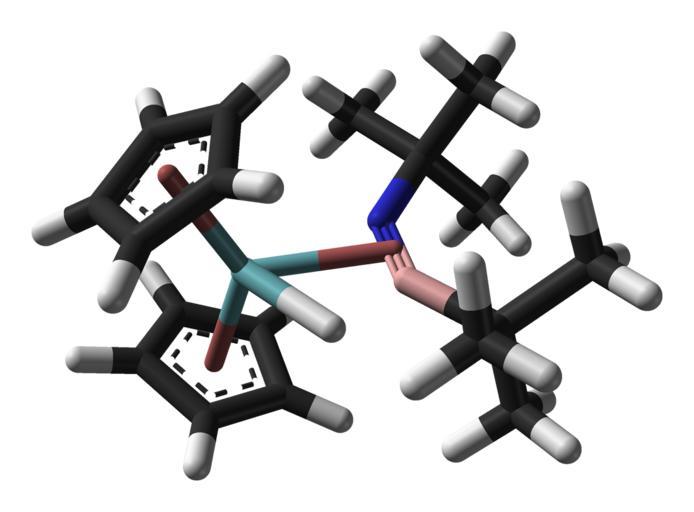 Keywords: Iminoborane-NbCp2-complex-from-xtal-1988-3D-sticks.png Stick model of the complex of tert-butyl tert-butylimino borane tBu-BN-tBu with Cp<sub>2</sub>NbH from the crystal structure X-ray crystallographic data from http //dx doi org/10 1002/anie 198809581 Angew Chem Int Ed 1988 27 958 959 Own 2008-03-25 Ben Mills Benjah-bmm27 Images by Ben Mills Tert-butyl tert-butylimino borane Niobium complexes Cyclopentadienyl complexes |