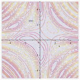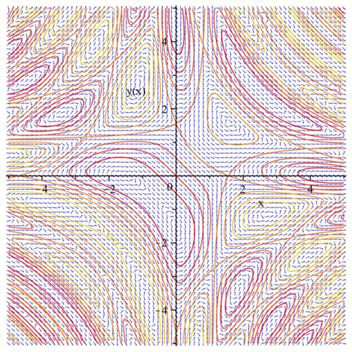 Keywords: Implicit Function Theorem.svg Demonstration of the Implicit Function Theorem The curves are the implicitly defined as <math>f x y \sin x+y -\cos xy C</math> with various values of the constant <math>C</math> The background slope field shows that if one is given a point on the curve then one can in principle generate a local piece of the curve defined as an explicit function of x or at least approximate it by tracing from slope field e g approximation by Euler's method which can be made as accurate as desired by choosing small step size; as step size approaches zero the result matches the actual local piece of curve more accurately Own 2008-05-08 Saran T Vector fields Implicit curves |