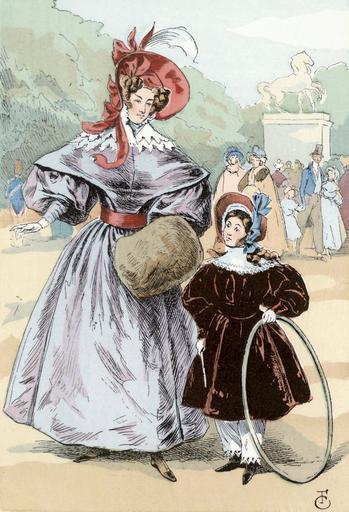 Keywords: In the Champs-Elysées, 1832.jpg Artwork This woman depicted in this plate is wearing a dress with leg-of mutton sleeves that billow out along the length of the arms a very wide bell skirt acccentuated by a narrow belted waistline most likely aided by a tightly laced corset Her hair is in plaits arranged close to her head and covered with an 'Alsatian cap ' or flat beret-style hat almost vertically at the back of the head The little girl is wearing pantalettes under her dress which is fairly elaborate and similar to adult clothing Abstract sources Boucher François 20 000 Years of Fashion New York Harry N Abrams Inc 1967 1898 colored plate 10 x 15 cm Institution Brown University Library object history exhibition history credit line Published in Octave Uzanne Fashion in Paris the various phases of feminine taste and aesthetics from 1797 to 1897 London William Heinemann 1898 accession number 1150467129967443 PD-old Les modes de Paris 042 Fashion plates depicting children 1832 Images of Paris from the Brown University Library 1832 in Paris Fashion in 1832 Avenue des Champs-Élysées in the 1830s Red hats in art Hoops in art Fur fashion in 1832
